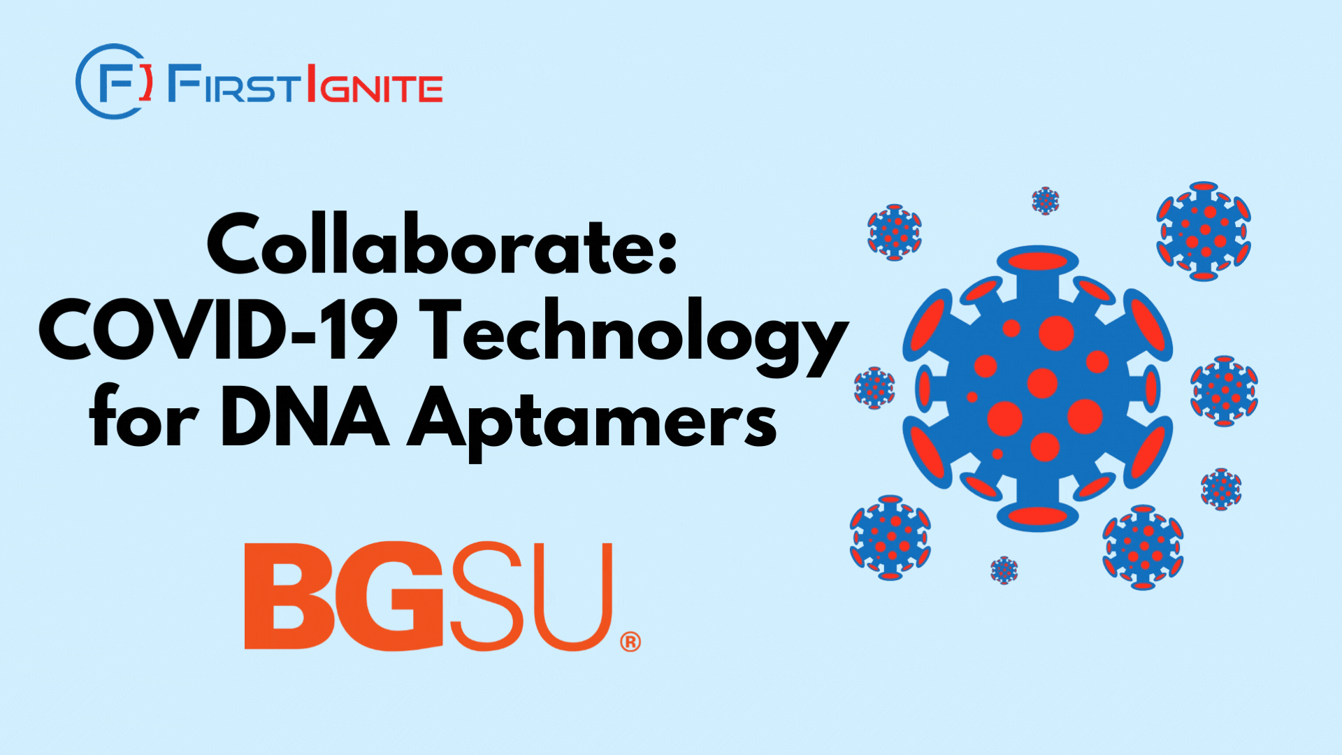 FirstIgnite is supporting the commercialization of Bowling Green State University’s new COVID-19 related technology for DNA aptamers as universal inhibitors of spike protein/hACE2 interactions. The benefits of this technology include that it is cost-effective, has low immunogenicity and toxicity, and can be manufactured using routine chemical synthesis. Additionally, it could bridge the gap for at-risk individuals and young children (ages 2-5) who can’t or shouldn’t take current COVID vaccines or therapies.