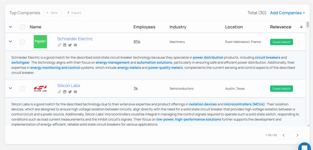 Review the list of companies provided by AI, which are highly relevant to your patent or publication